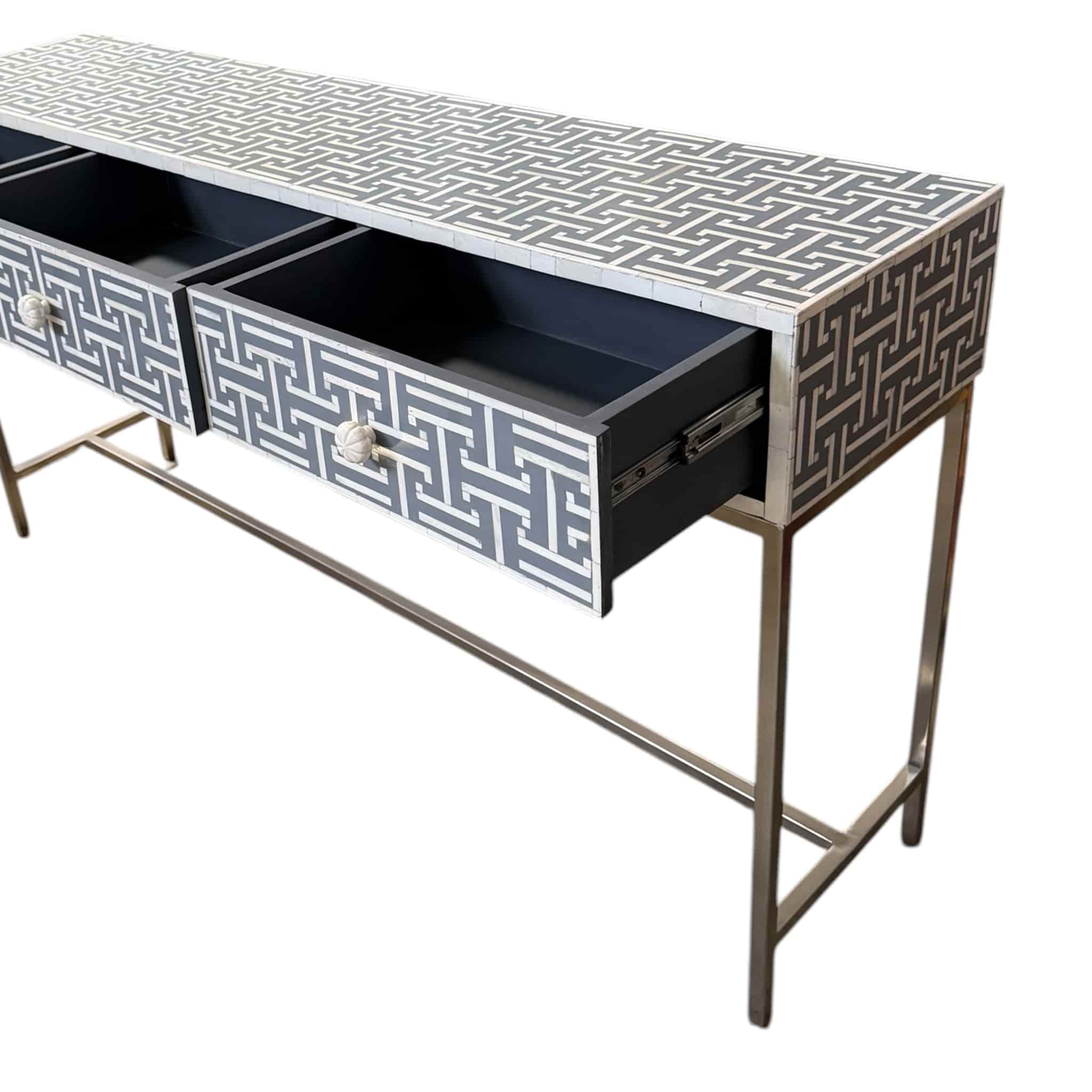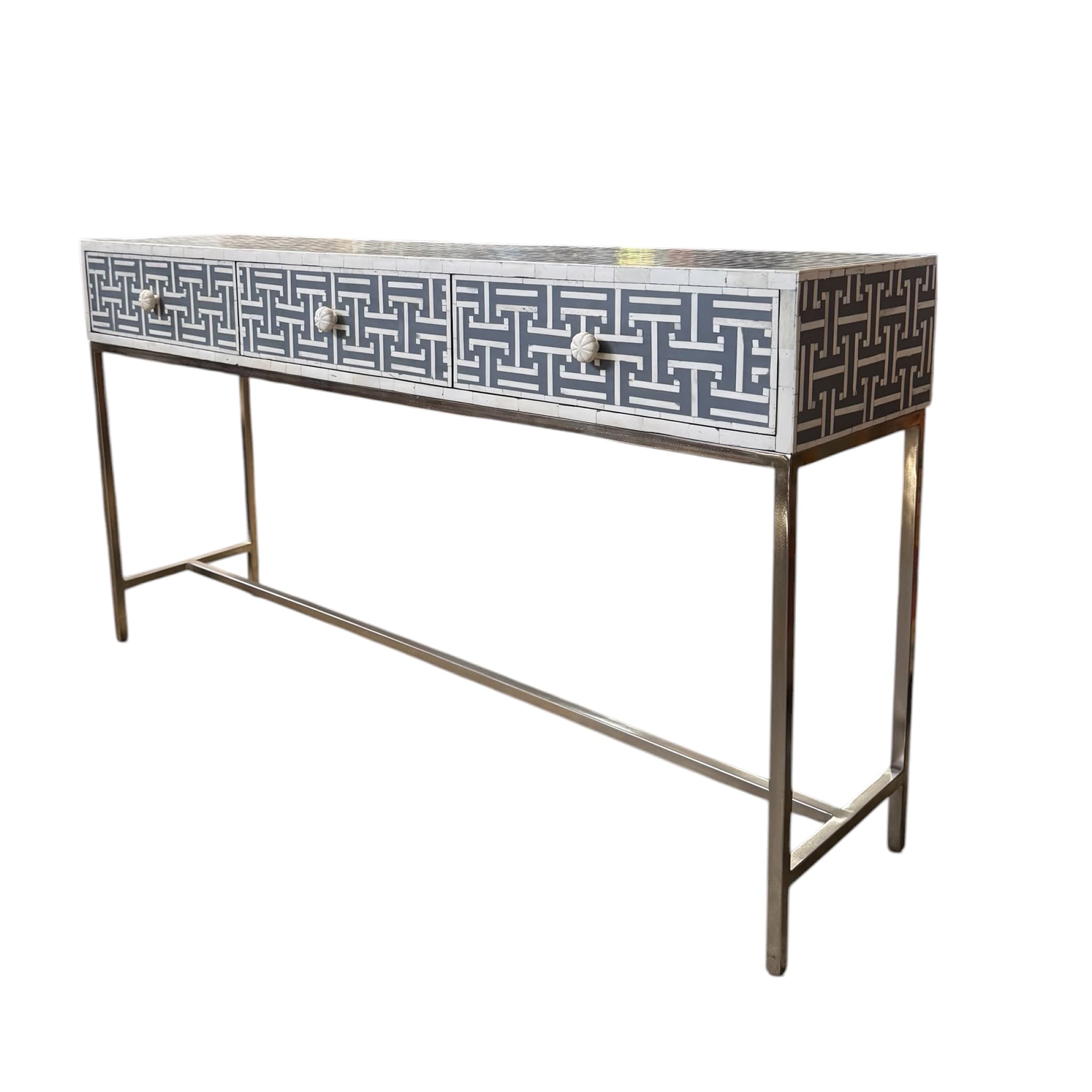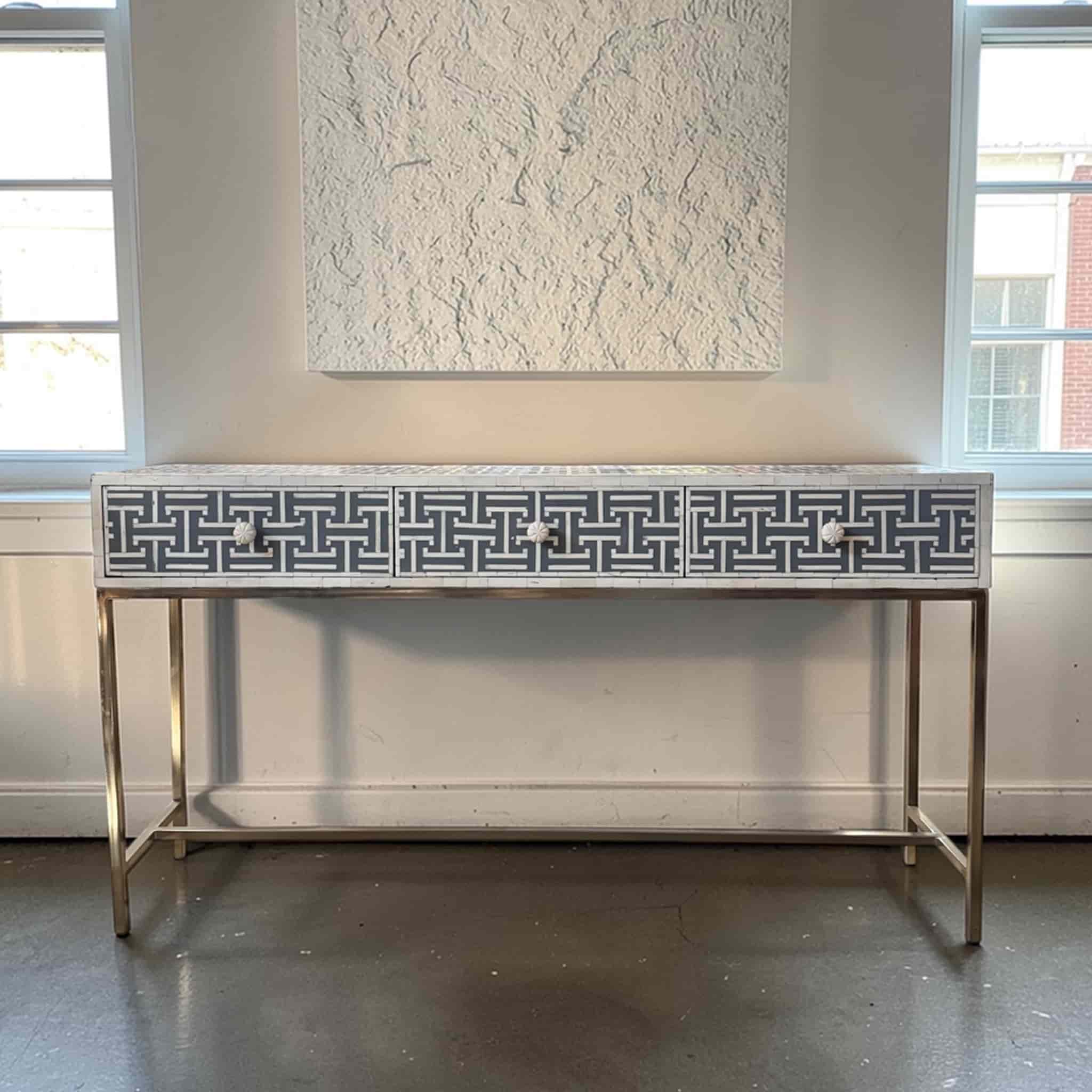 The Aegean Bone Inlay Console Table Grey Resin is a modern masterpiece. The intricate bone inlay pattern is set in soft grey resin, creating a sophisticated mosaic. Supported by a sleek stainless steel base, this 3-drawer console offers both artful design and practical storage for hallways or living rooms.