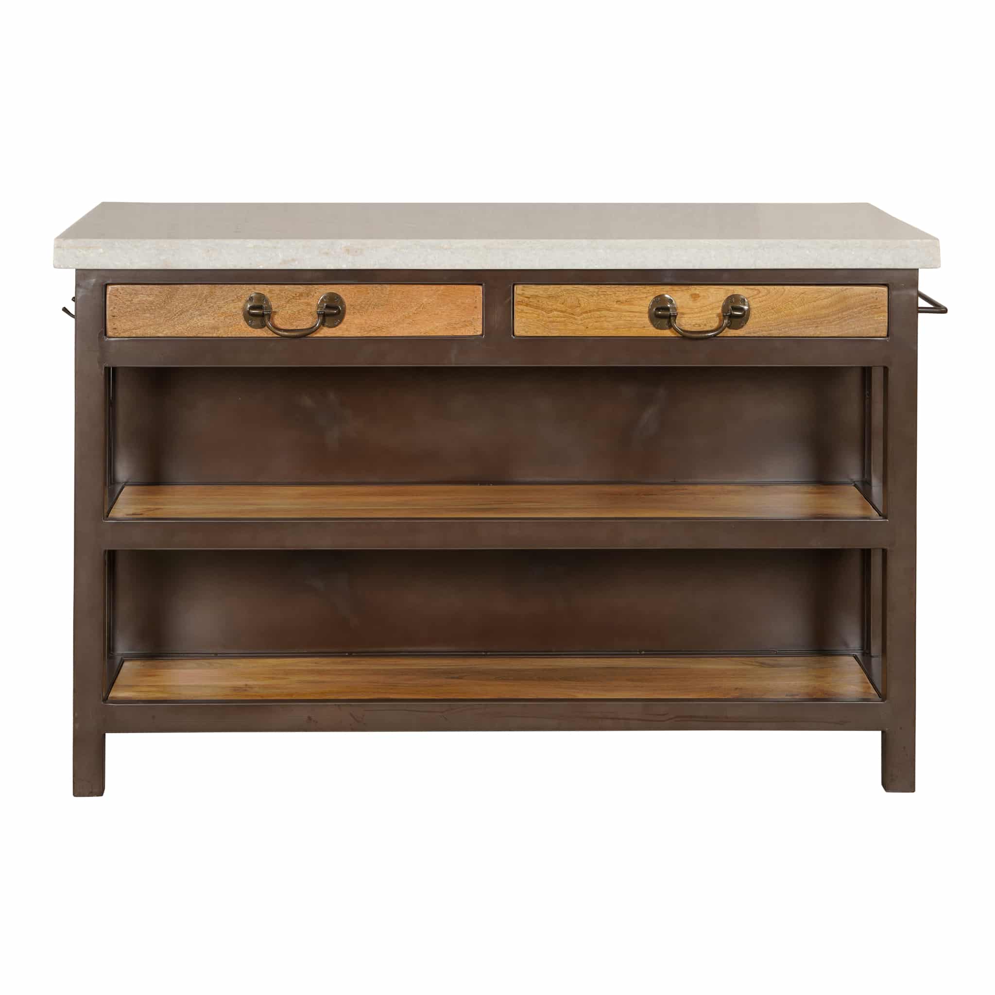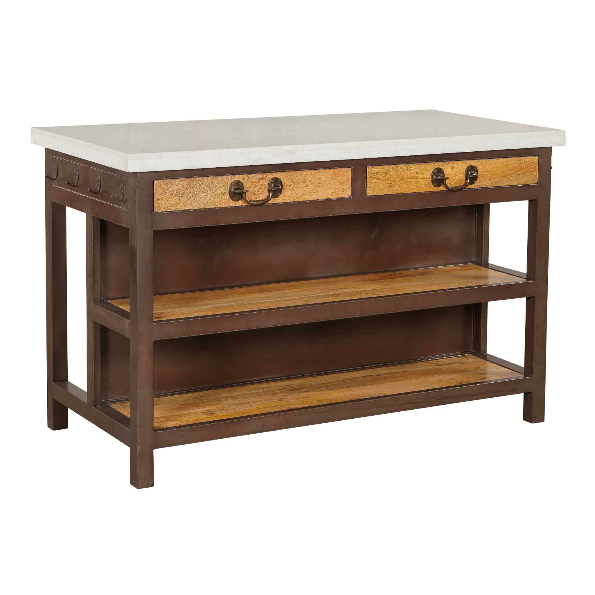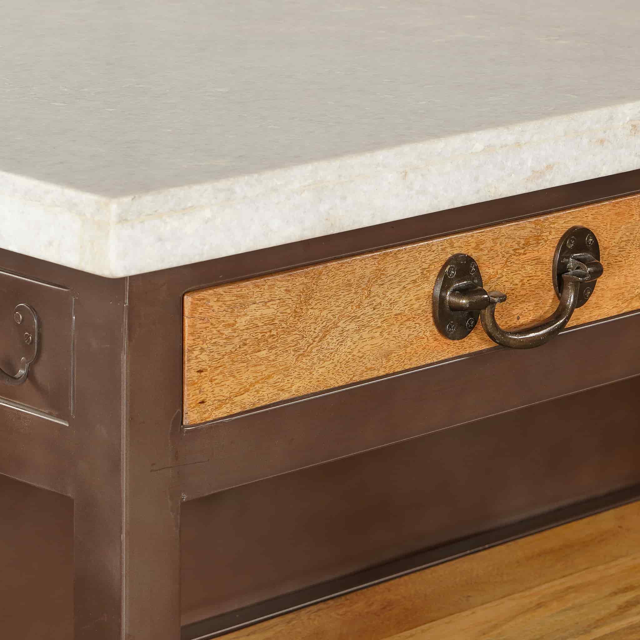 The OLIVER Kitchen Island blends industrial strength with natural warmth. Crafted with a powder coated iron base, natural wooden drawers and shelves, and finished with a premium marble slab top.