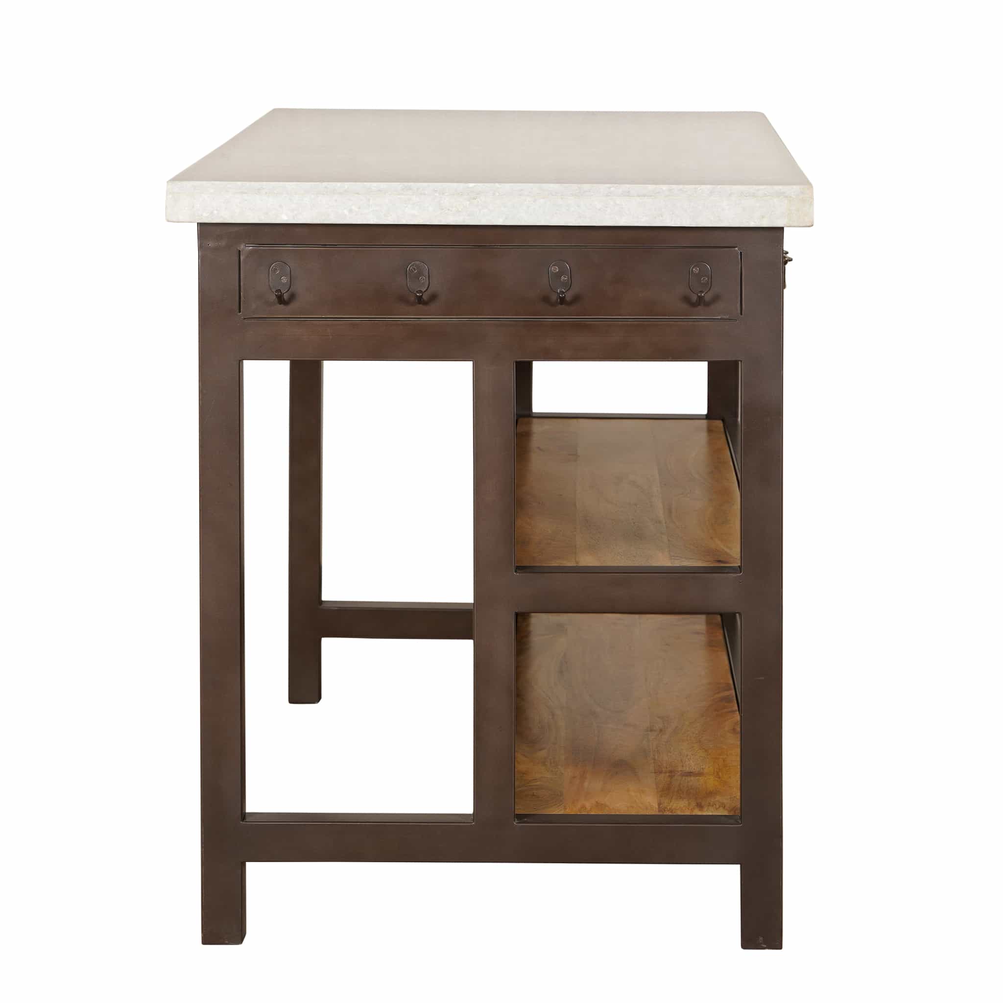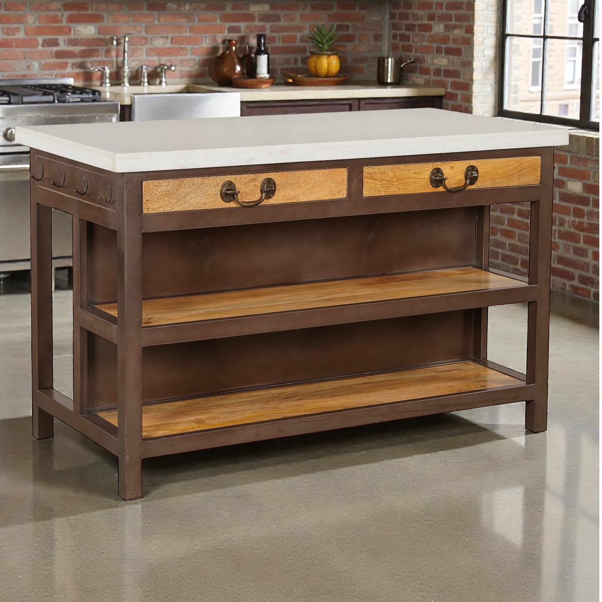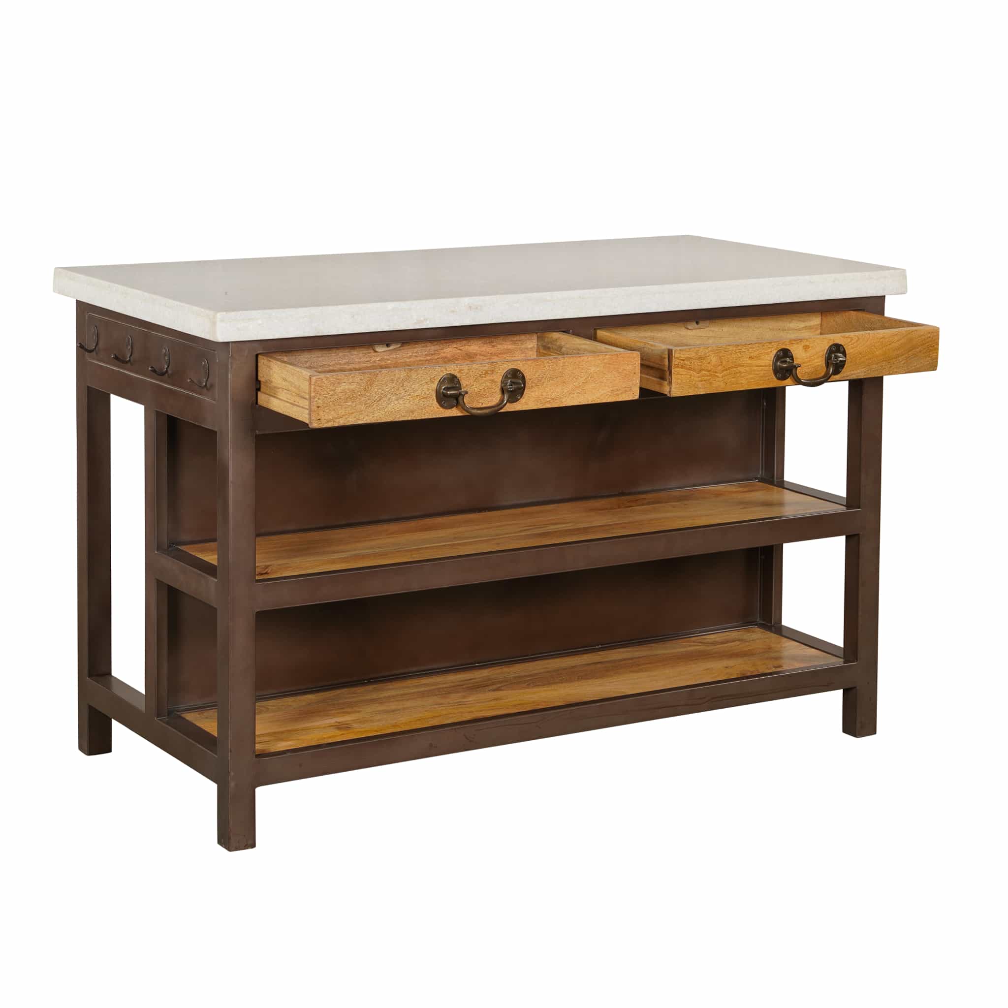 The OLIVER Kitchen Island blends industrial strength with natural warmth. Crafted with a powder coated iron base, natural wooden drawers and shelves, and finished with a premium marble slab top.