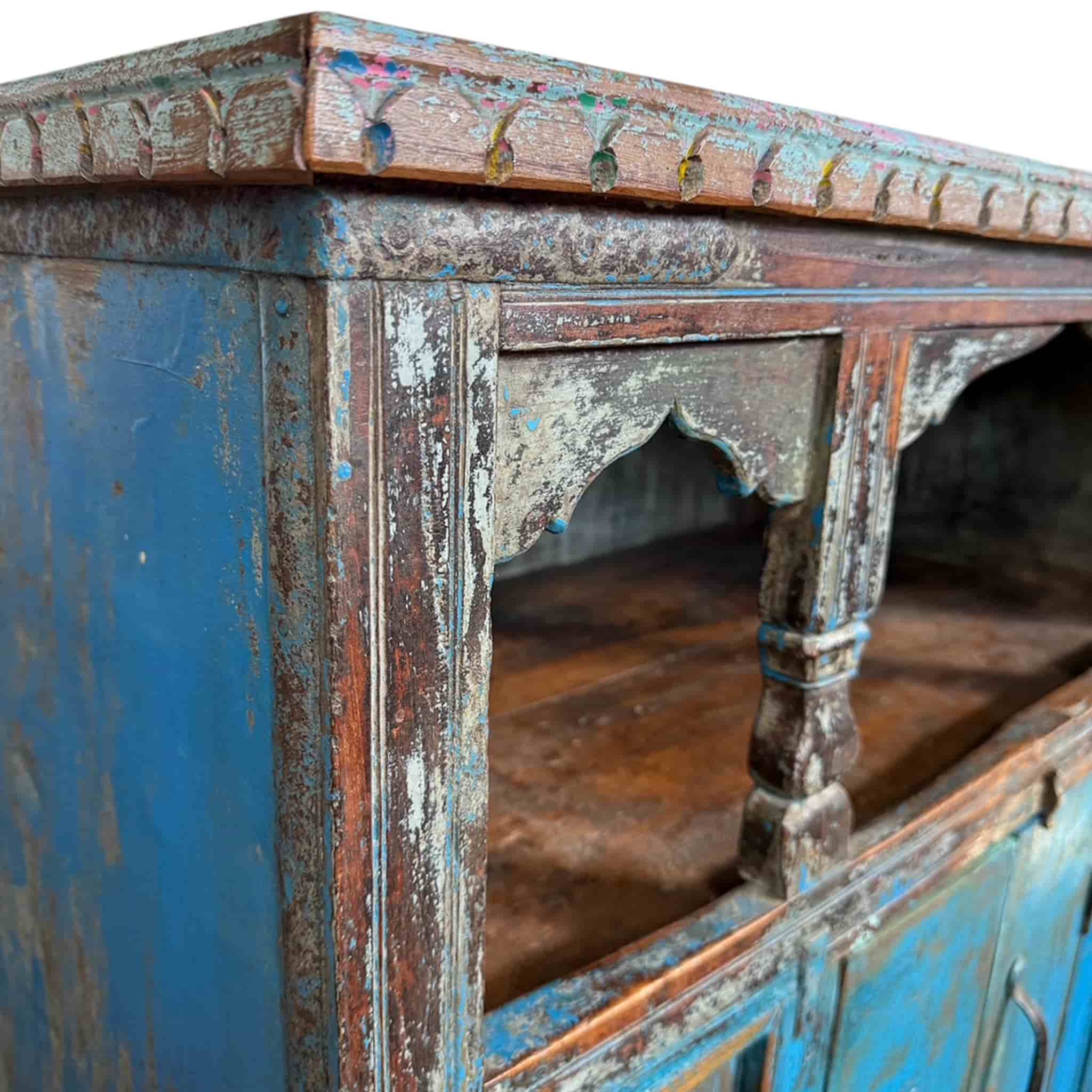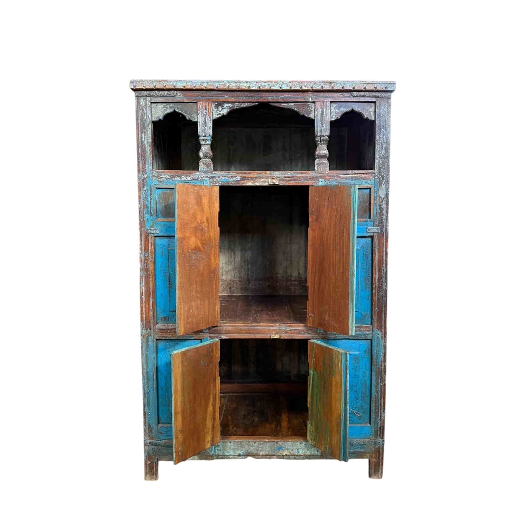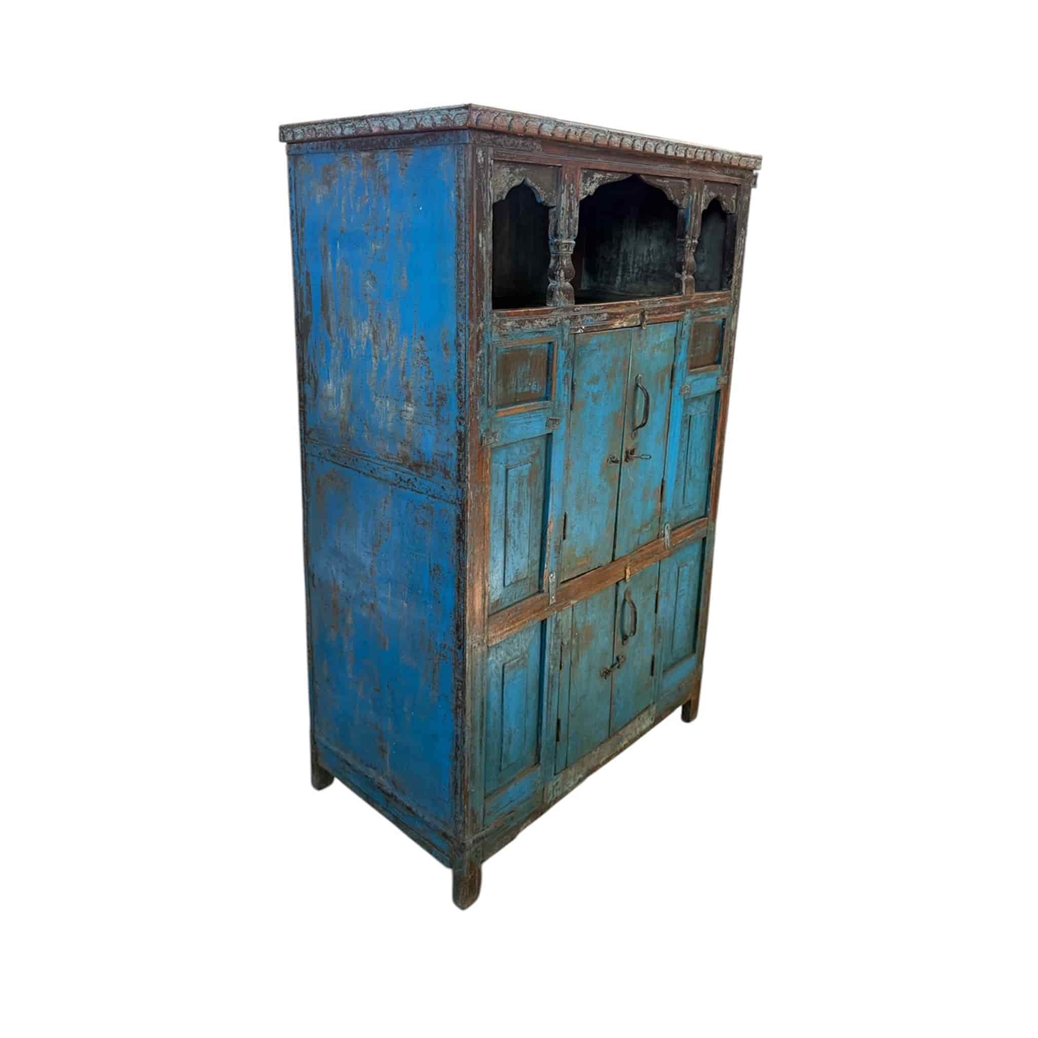 The Brahman Vintage Cabinet Jodhpur Blue is a piece of living history. Originating from the Blue City of Jodhpur, this unique vintage cabinet retains its original rustic blue patina. Features 4 doors and an open Marwari arched top section for displaying curios.