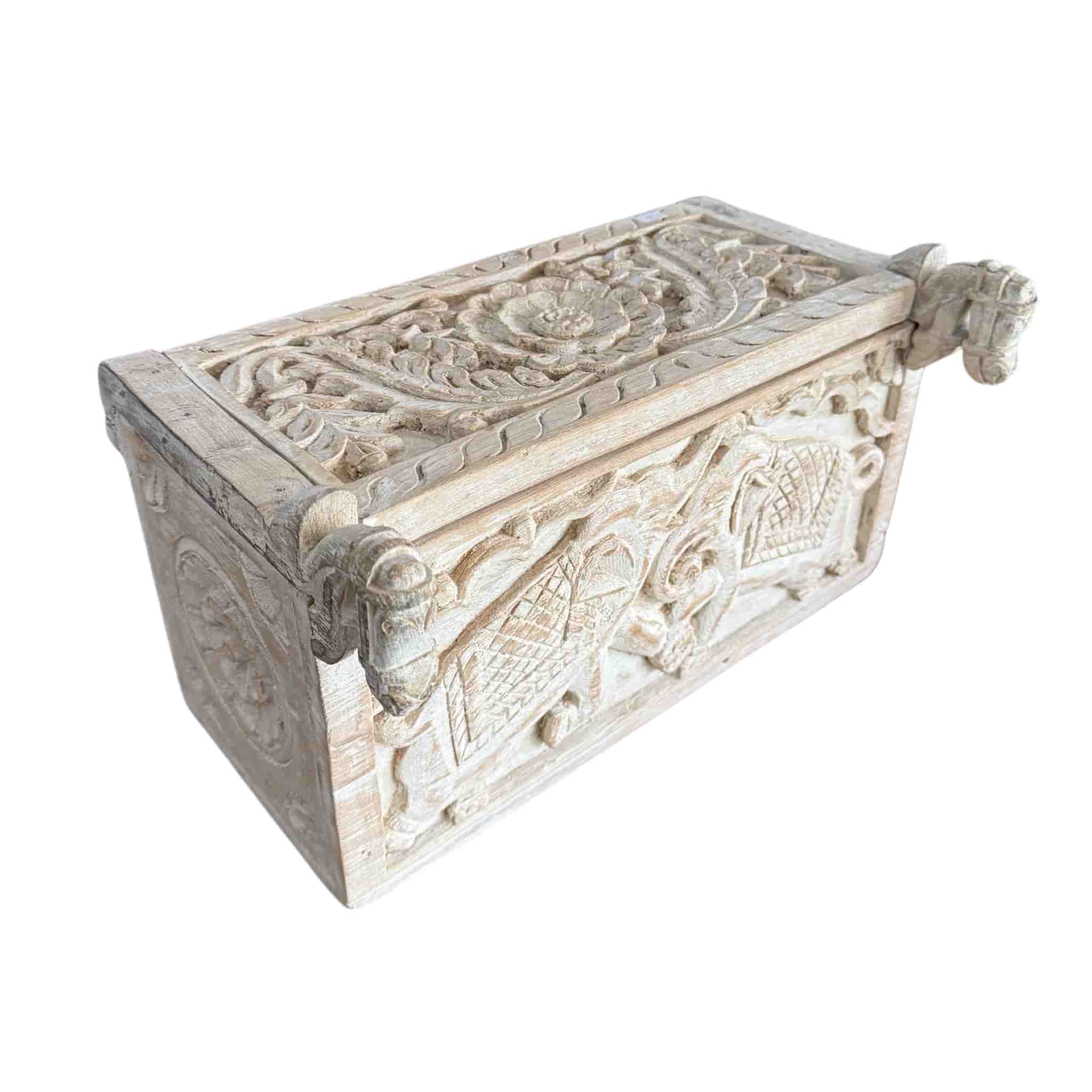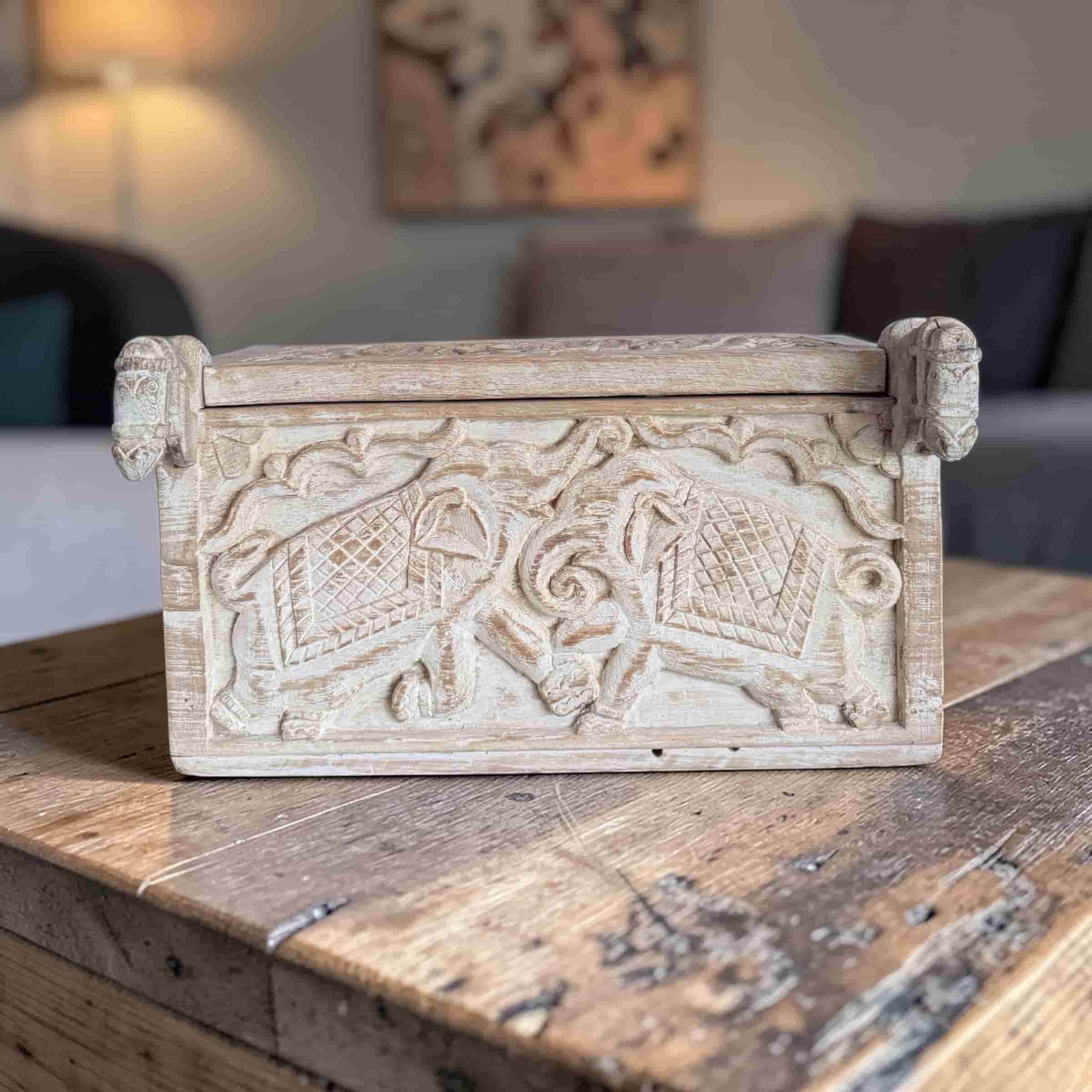 This beautifully hand carved Elephant Storage Box is crafted by master artisans in Rajasthan, North India using sustainably sourced mango wood. Rich in traditional craftsmanship, the piece features detailed elephant carvings combined with intricate mandala floral patterns, creating a design that reflects heritage, symbolism and timeless artistry.