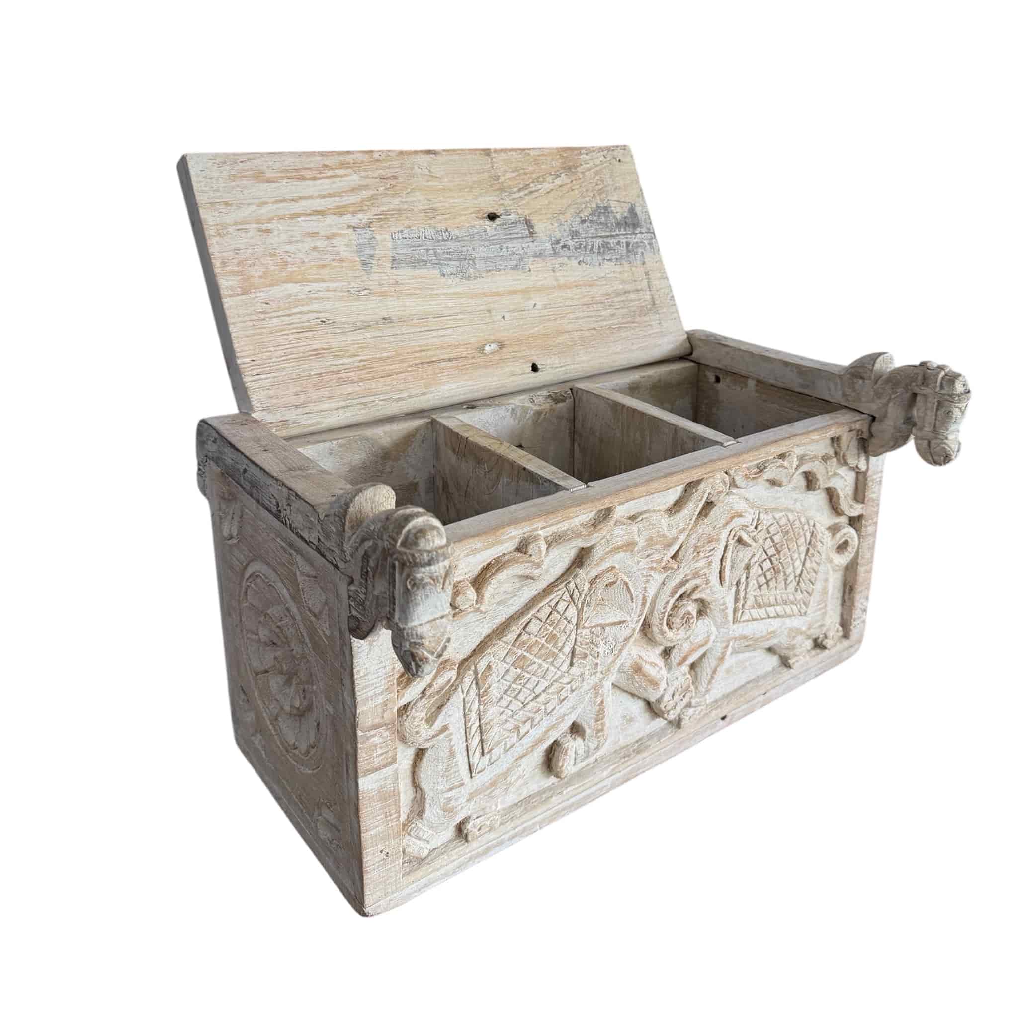 Hand carved elephant storage box crafted by master artisans in Rajasthan, North India from sustainable mango wood. Featuring detailed elephant and mandala floral carvings, the box opens to three internal compartments ideal for storing jewellery, spices, keepsakes or small household items. A beautiful decorative storage piece for the bedroom, living room or kitchen.