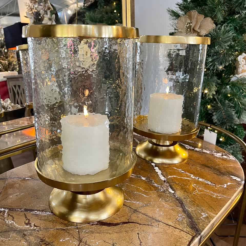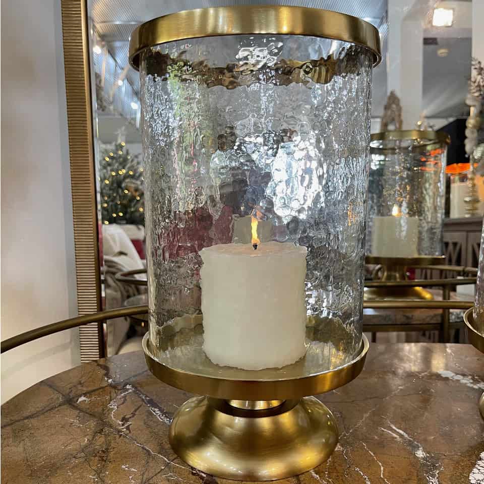 The Gold Hurricane Candle Holder Large creates instant ambiance. The satin gold metal base supports a handblown mottled glass cylinder, which diffuses candlelight beautifully. Perfect for dining tables or creating a spa-like feel in a bathroom.
