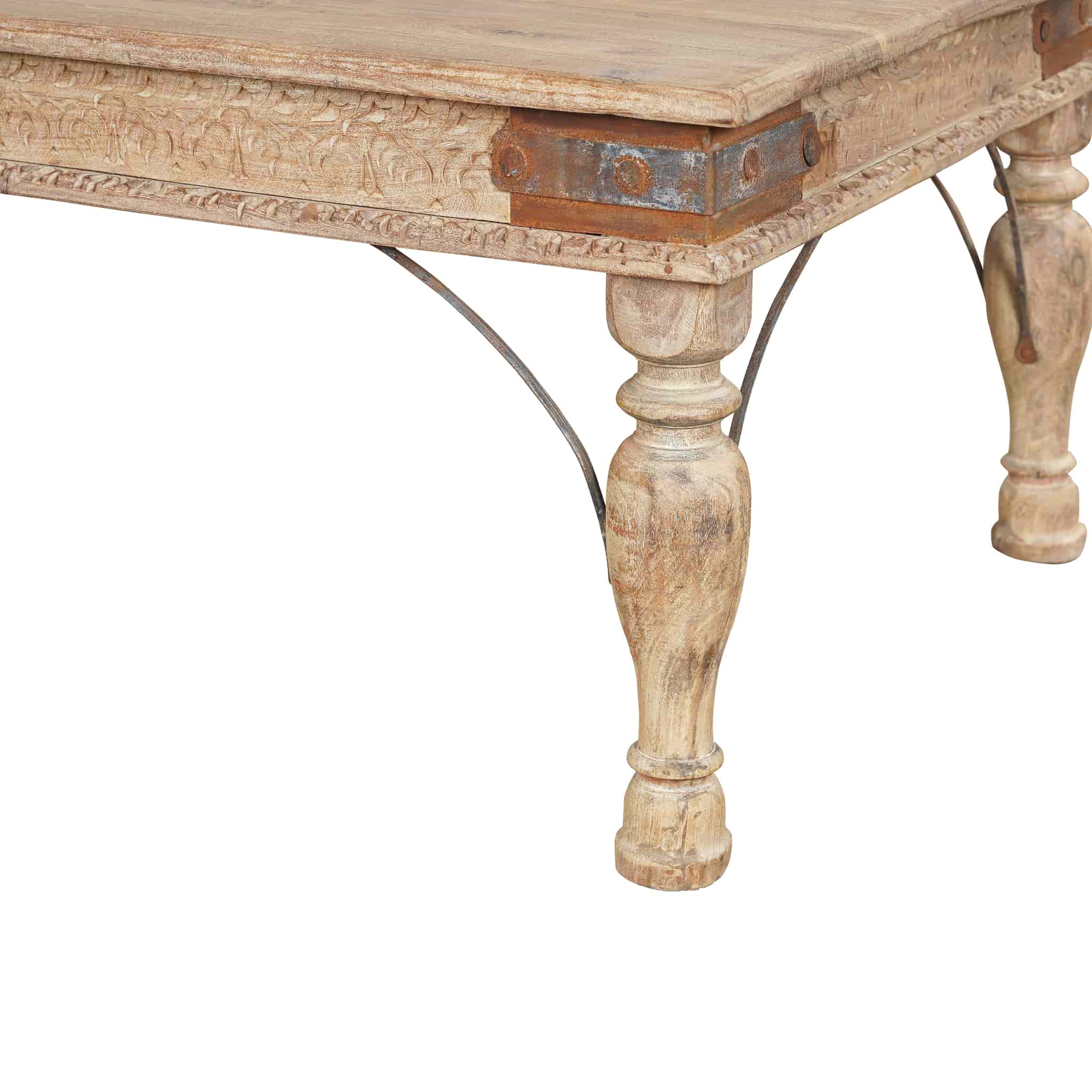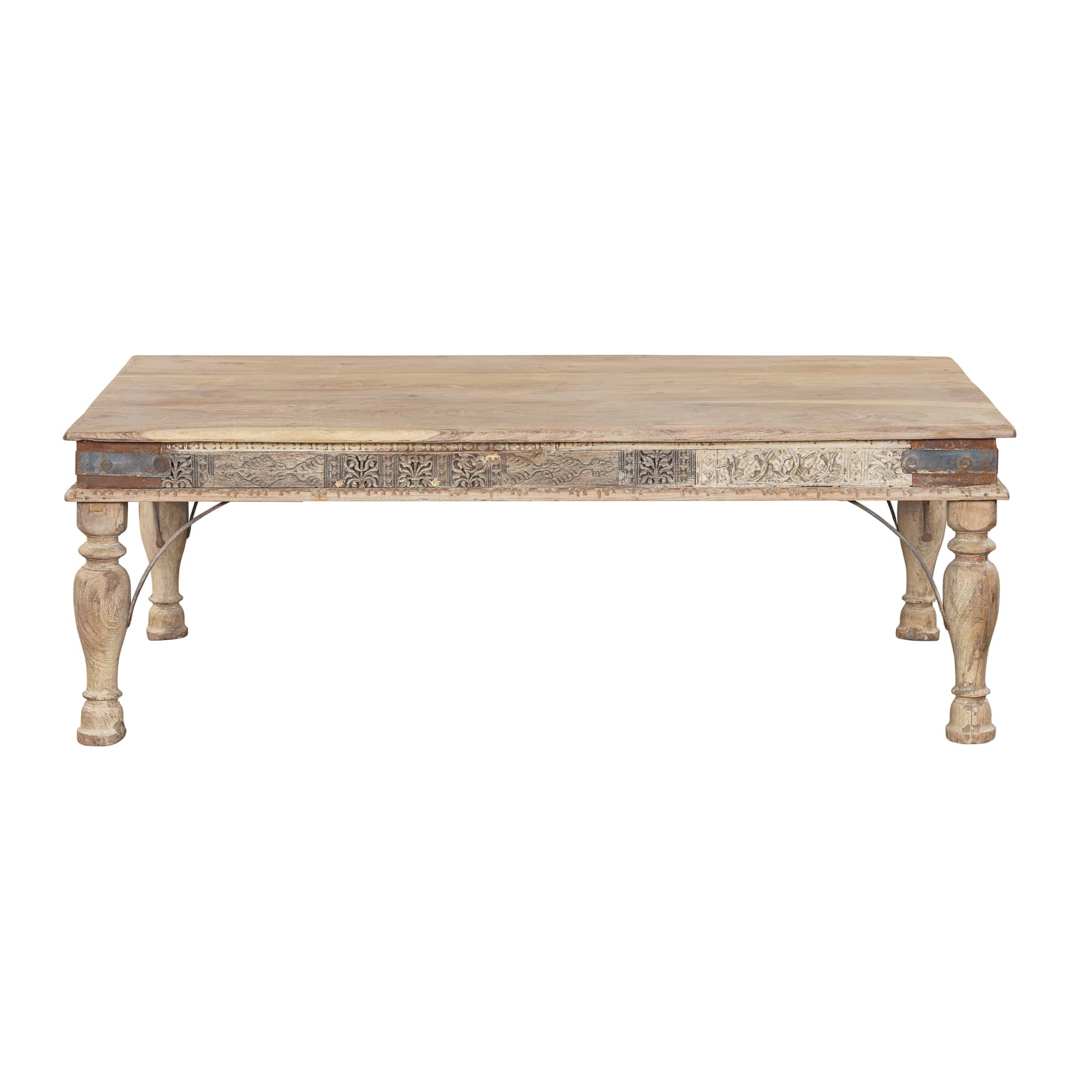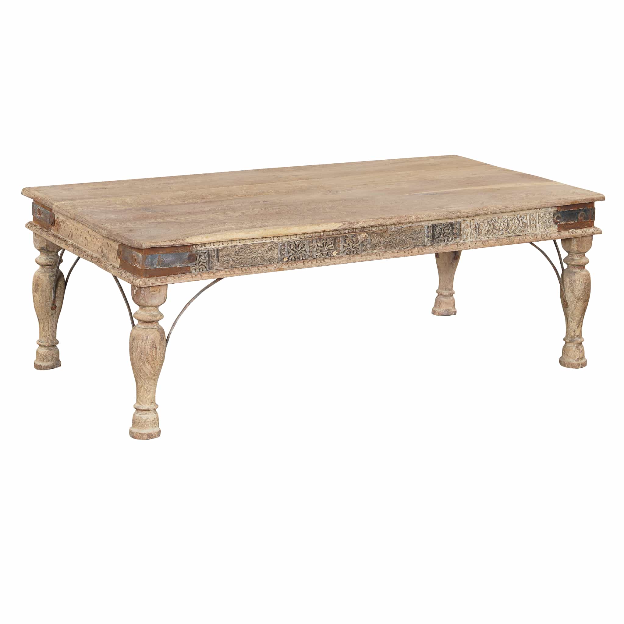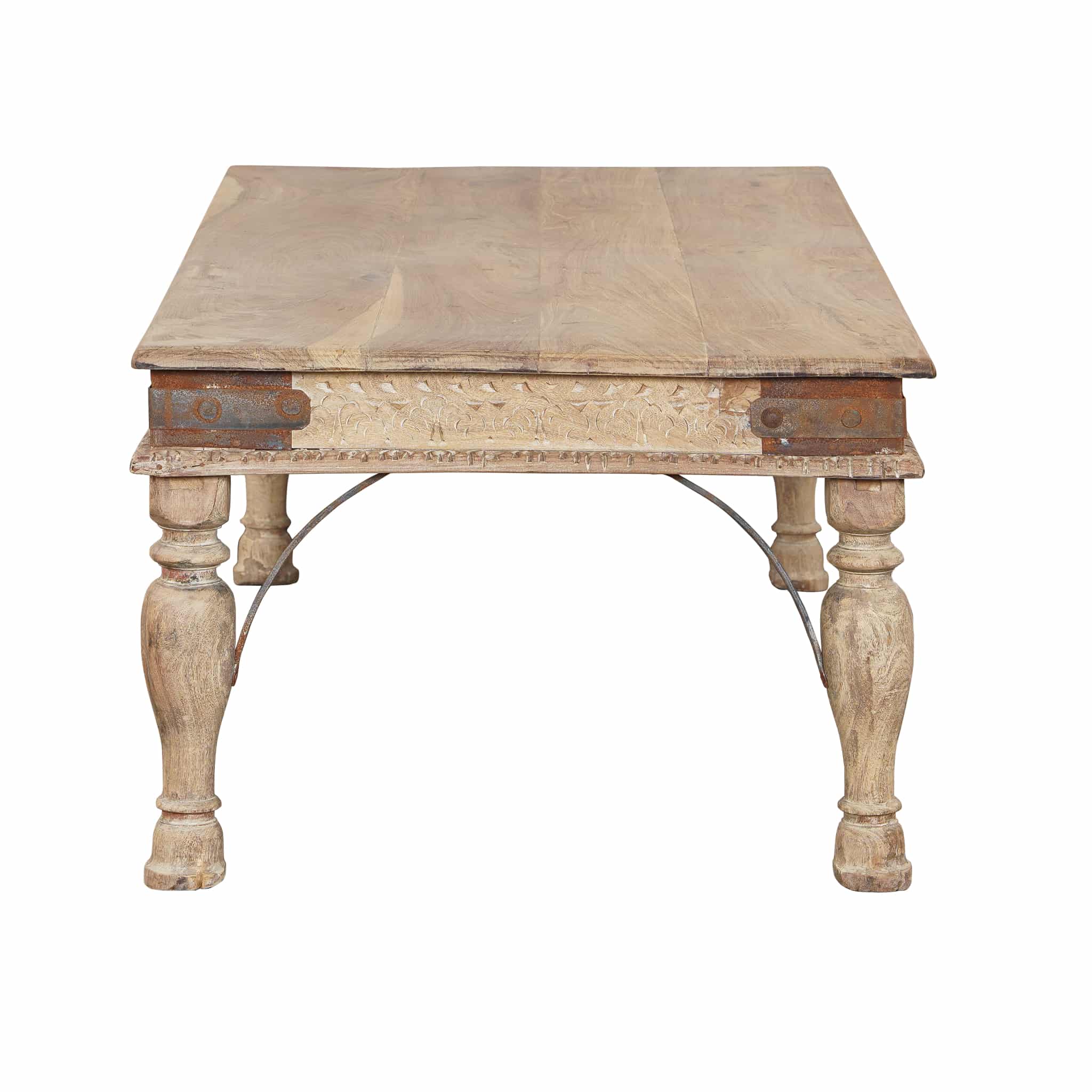 Steeped in history and craftsmanship, this vintage Indian coffee table originates from North Rajasthan and carries the unmistakable charm of old-world design. Crafted from solid reclaimed timber, the table showcases authentic carved detailing along the apron, aged iron corner brackets and beautifully turned legs that reflect traditional Haveli architecture.