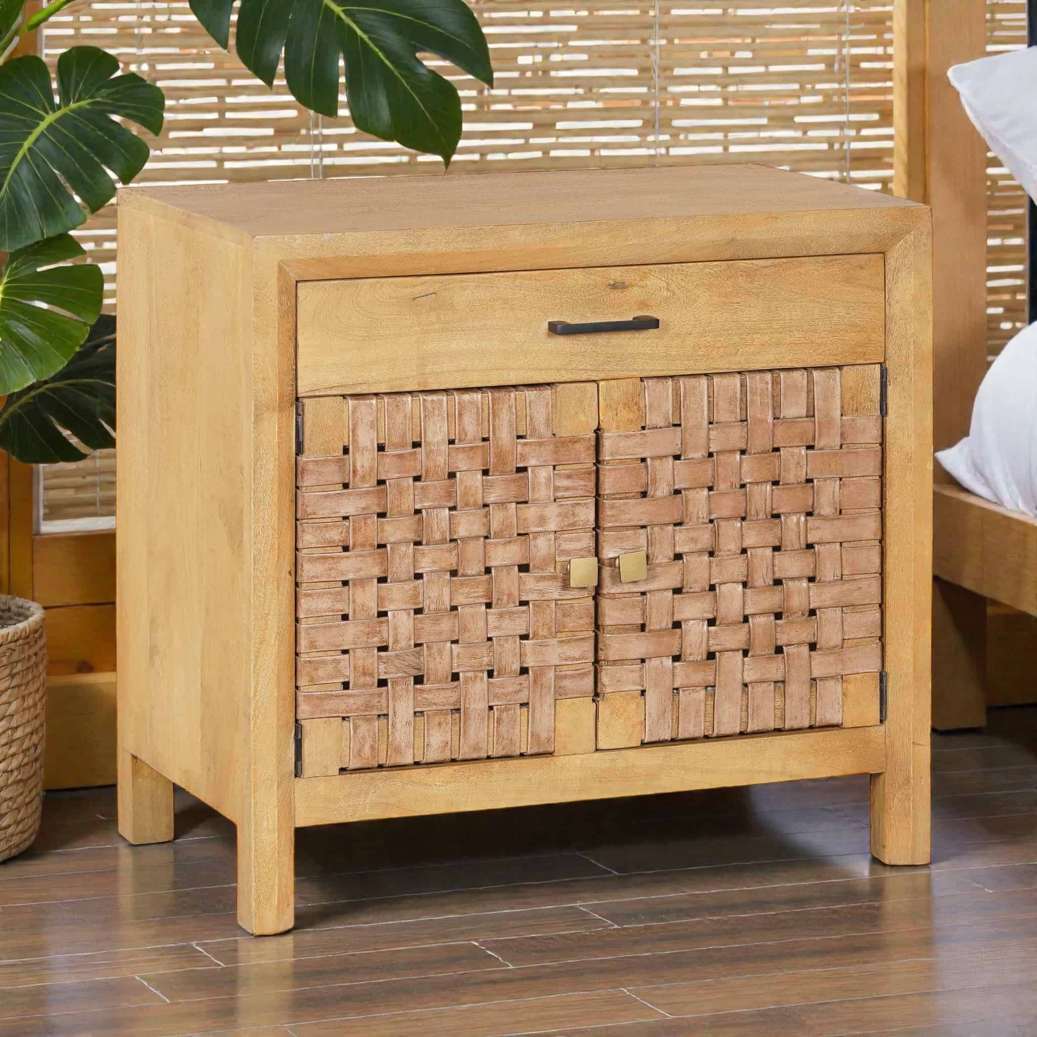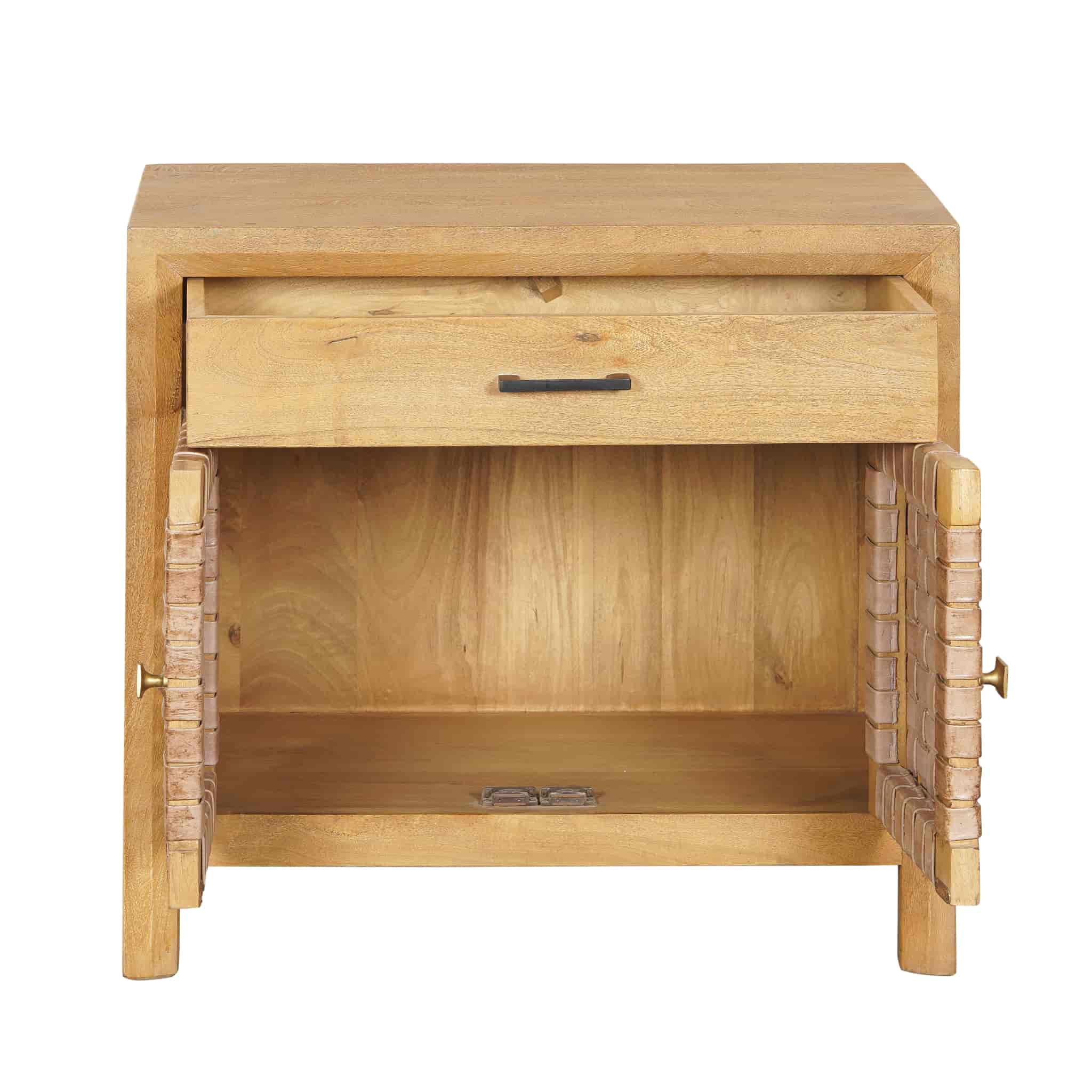 The natural character of mango wood paired with the rich texture of buffalo leather creates warmth and depth, making each piece uniquely individual. The top drawer provides easy access to smaller items, while the double-door cabinet keeps larger belongings neatly concealed.