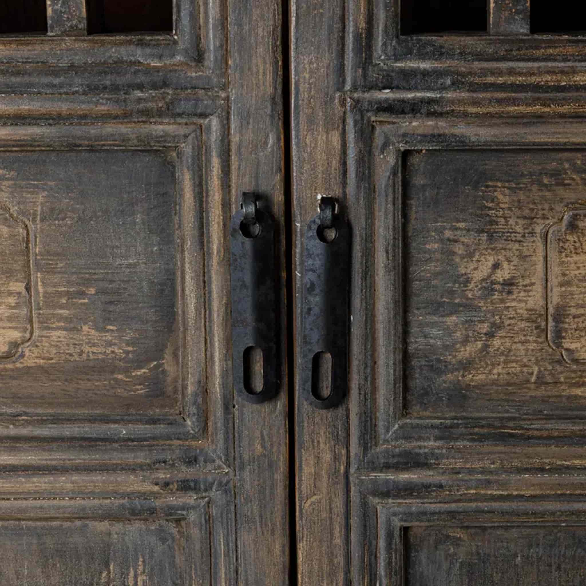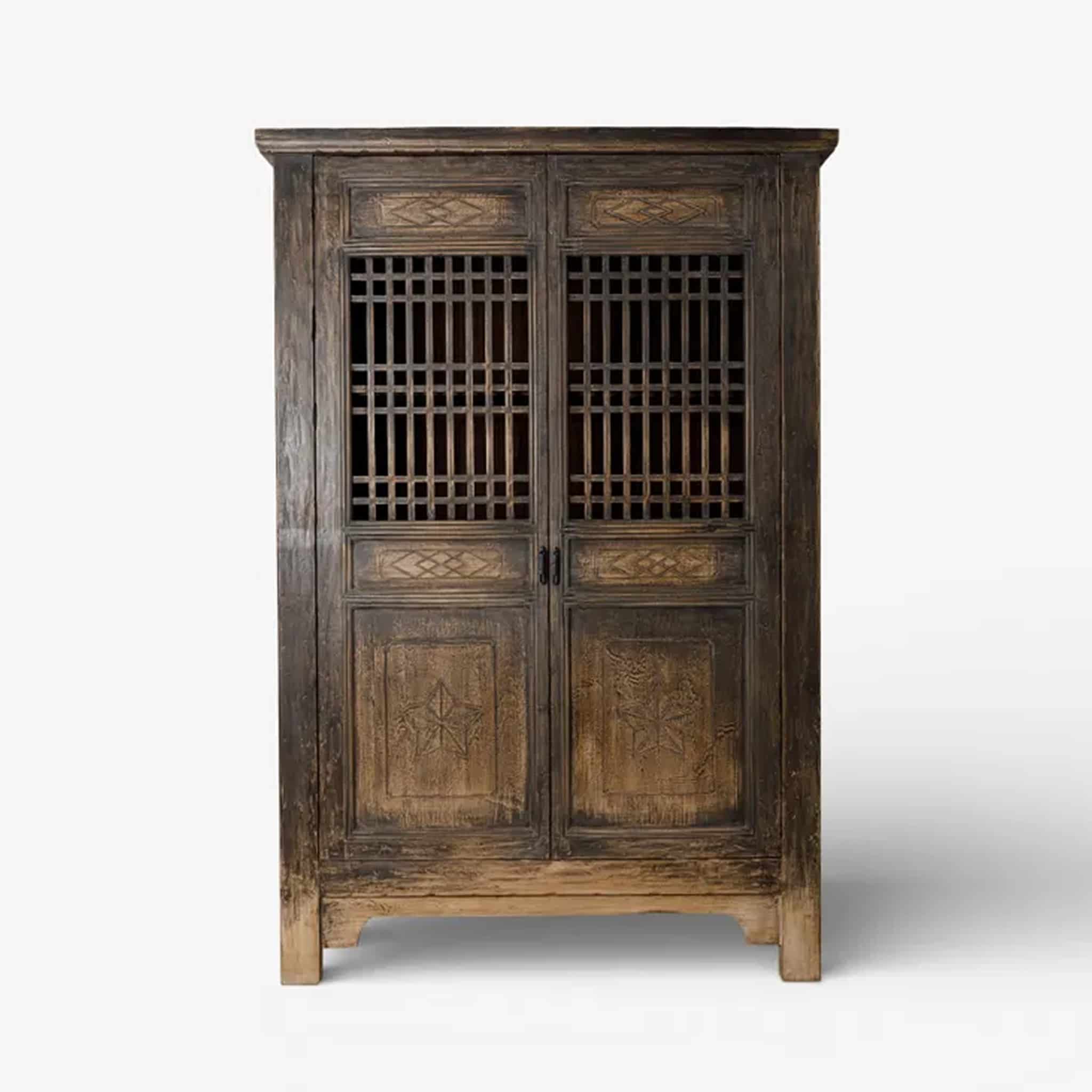 The Nomad Cabinet is a statement reclaimed pine piece featuring intricate carving and gridded panel detailing in an aged black finish. With its timeworn vintage-boho character and Modern Rustic appeal, it brings warmth, texture, and heirloom charm to living rooms, bedrooms, or hallways.