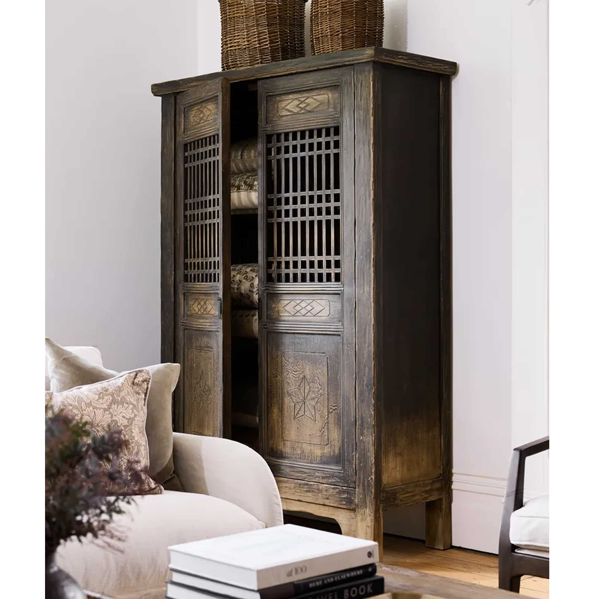Finished in an aged black tone, the cabinet enhances the natural grain and texture of the timber, celebrating honest materials and traditional craftsmanship. Its tall, commanding silhouette makes it both functional and visually impactful, offering generous storage while serving as a statement feature.