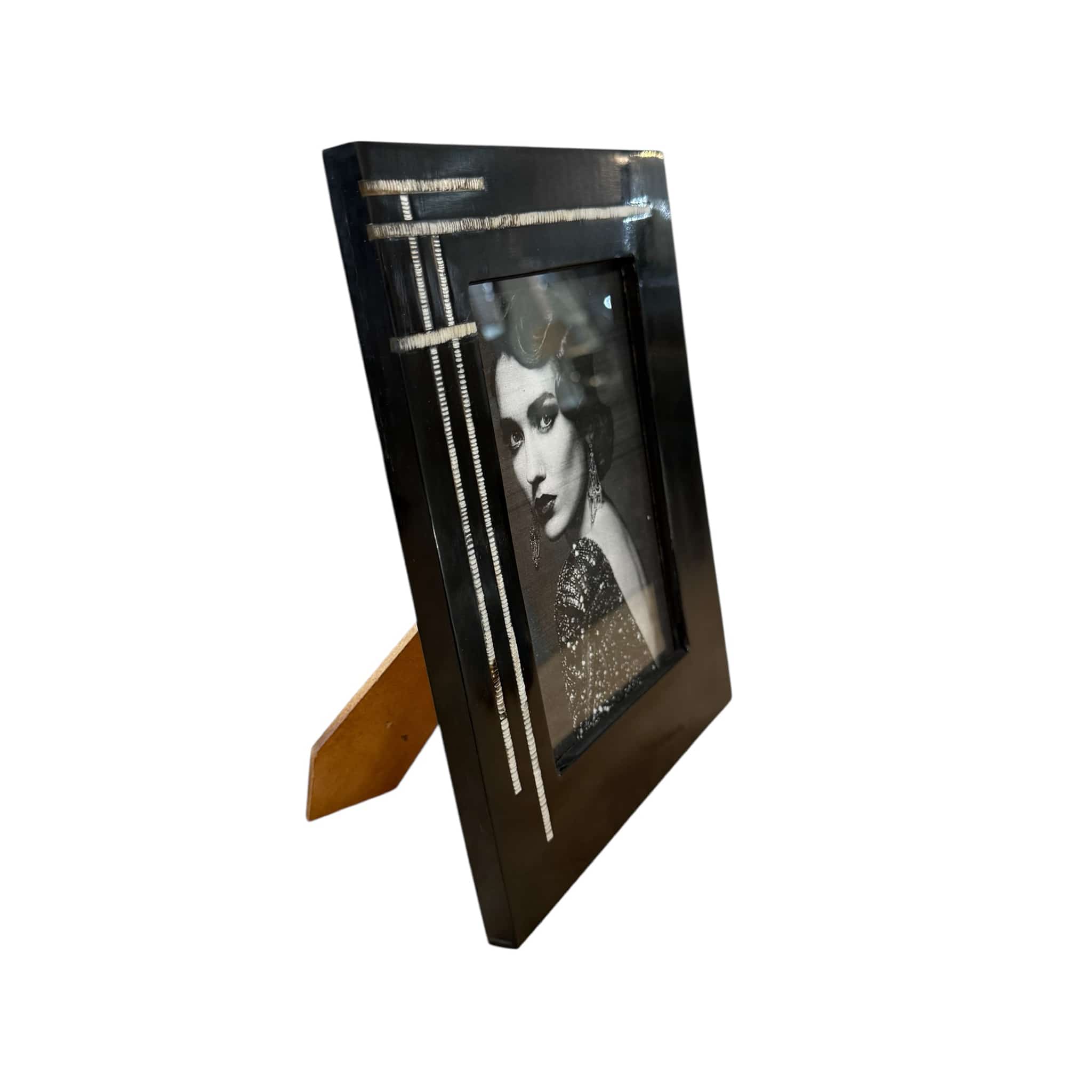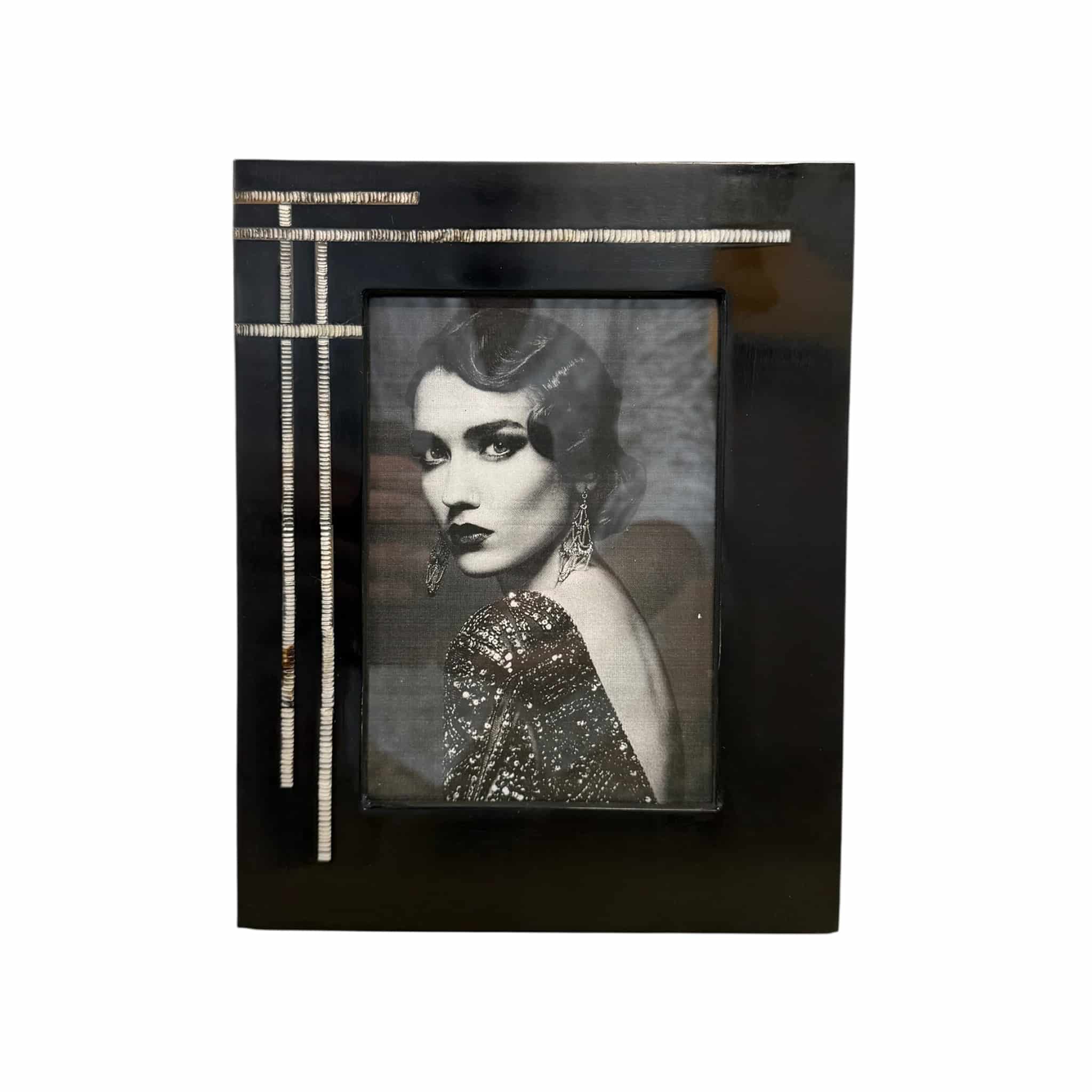 The Riem 5×7 Photo Frame is a striking handcrafted piece made from black resin with hand-etched inlaid horn stripe detailing. Designed to fit 5×7″ photographs, it adds bold elegance and texture to any console, desk or bedside table.
