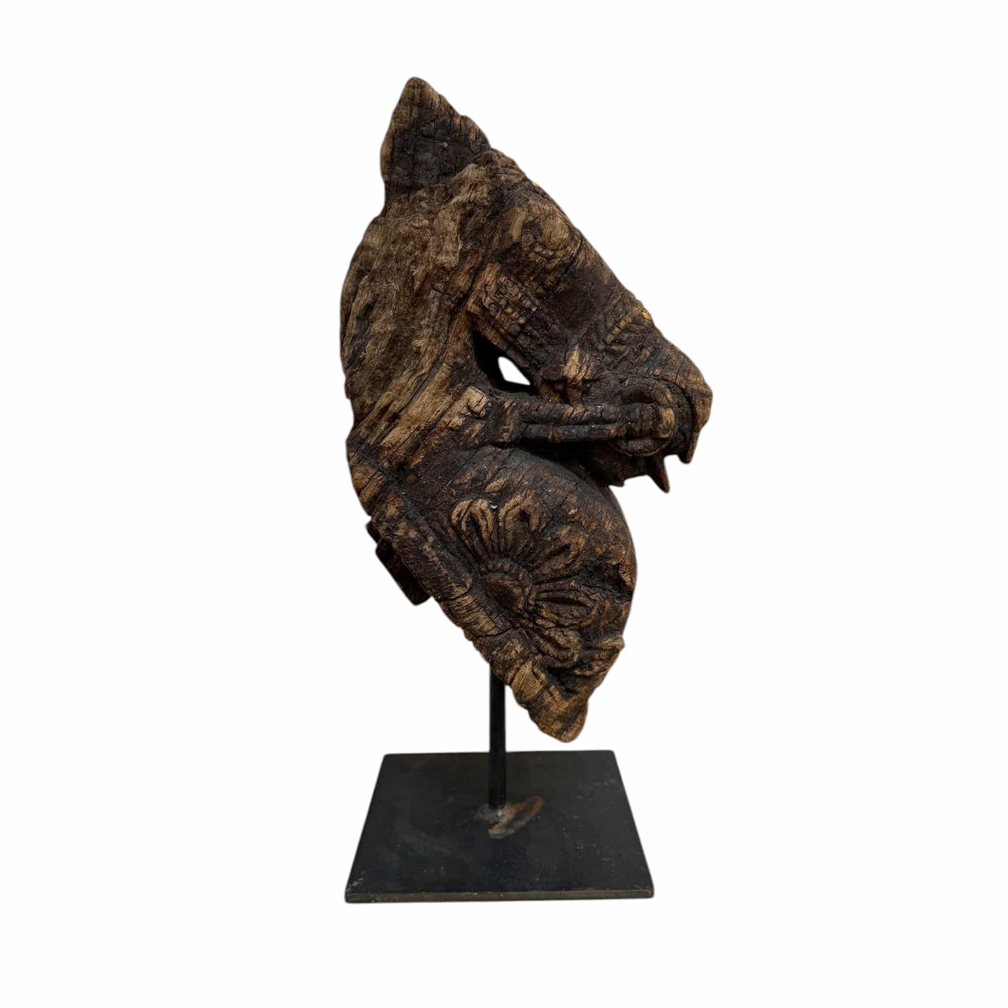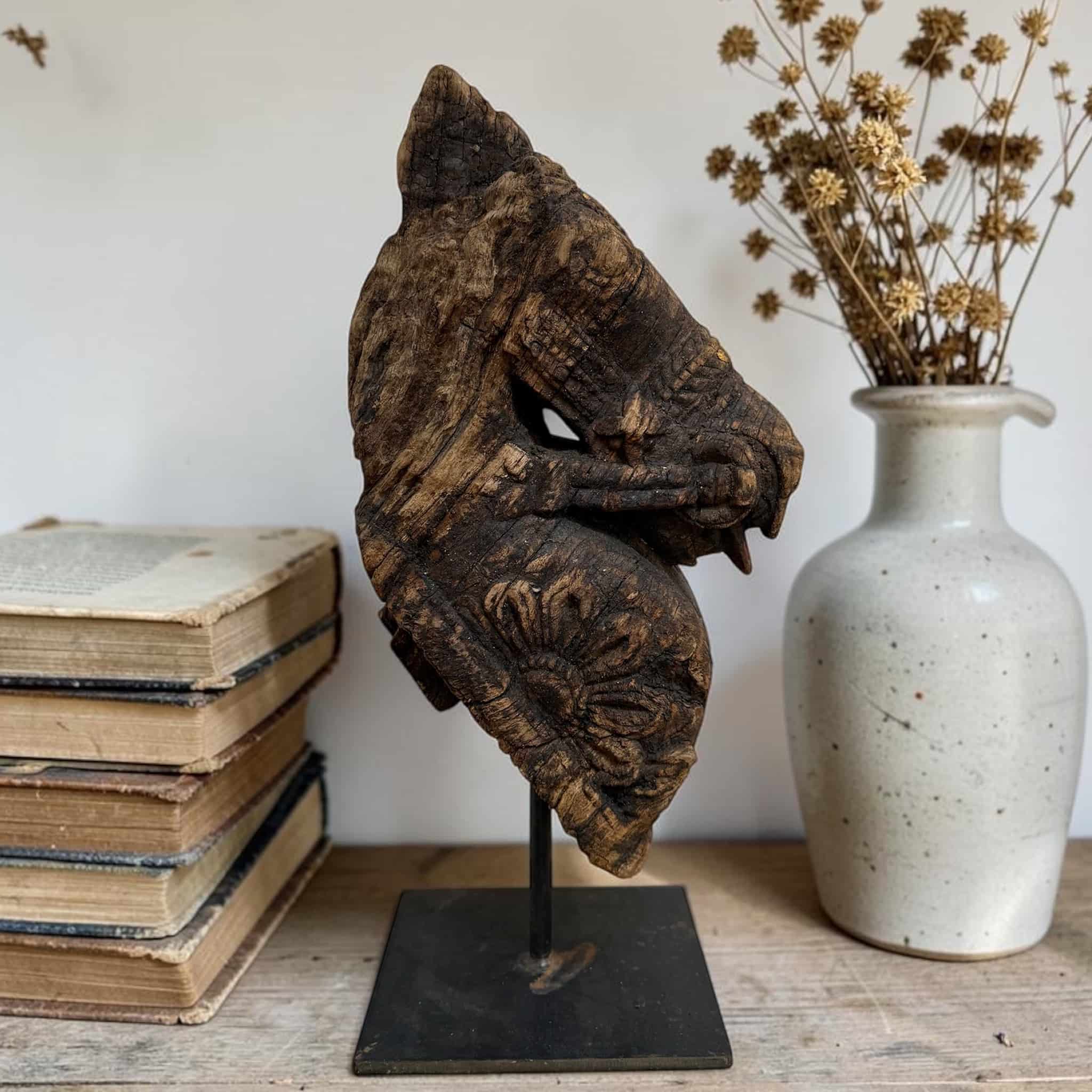 The Vintage Horse Sculpture on a black metal stand is a compact piece of history. A unique antique 80-90 years of age originally mounted on doorways in Nth India , Rajasthan . This smaller vintage carving captures the noble profile of the Marwari horse. Mounted on a stand, it fits perfectly on mantels, desks, or sideboards. 25 x 17 x 49 h cm