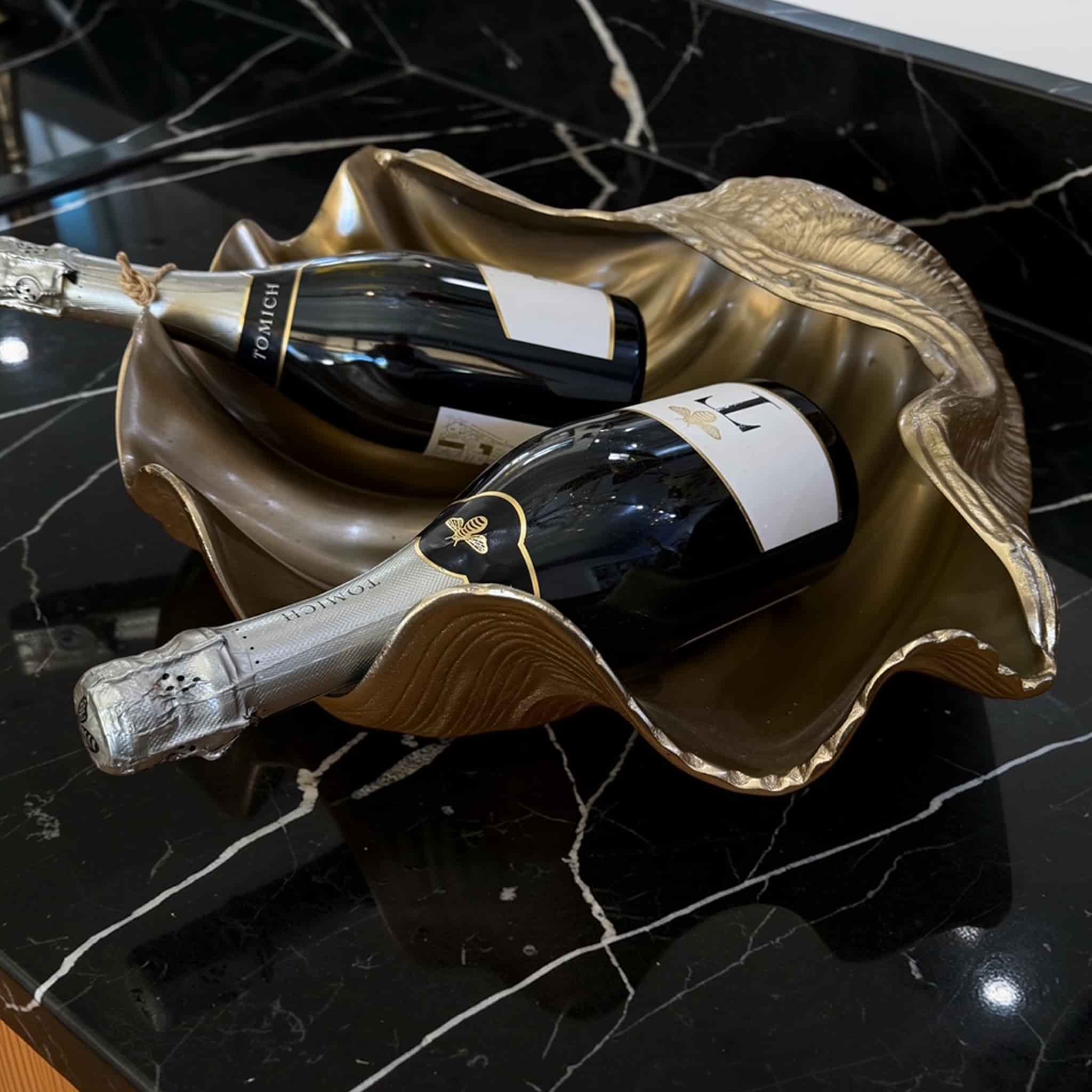 The Vongole Gold Champagne Bucket is a striking sculptural piece crafted in the shape of a clam shell. Handcrafted from aluminium and finished with a nickel coating in antique gold, this elegant bucket is perfect for chilling champagne, wine, or displaying fruit, bringing a touch of coastal luxury to entertaining.