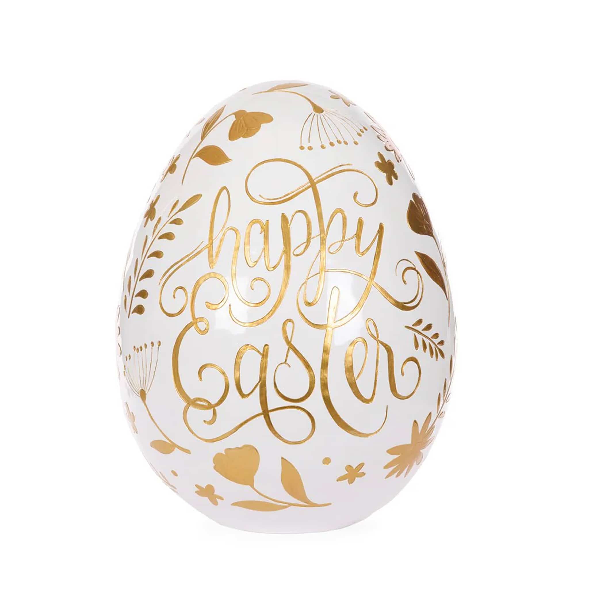 Crafted from high-quality resin, the egg features a smooth white finish adorned with elegant metallic gold botanical motifs and flowing “Happy Easter” script across the front. The intricate floral detailing combined with the luxurious gold accents creates a refined and timeless aesthetic that suits both classic and contemporary interiors.