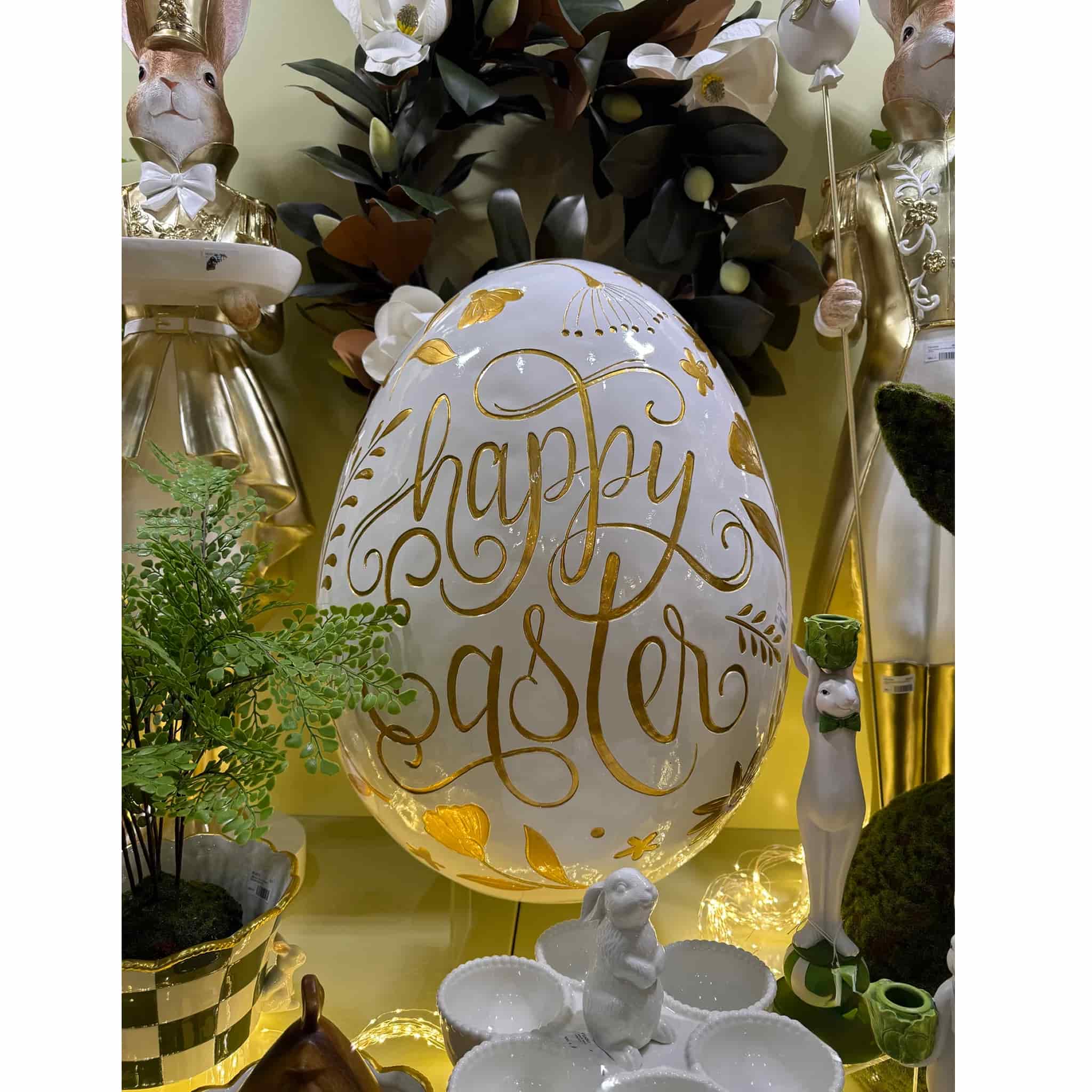 White and Gold Happy Easter Egg crafted in premium resin, 48 x 48 x 63.5cm. Featuring elegant gold botanical detailing and flowing script, this stunning statement piece is perfect for celebrating Easter in sophisticated style.
