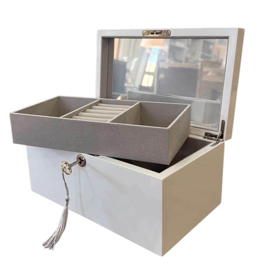 Elegant white gloss jewellery box with a piano finish and grey velour interior. Includes a lift-out tray, mirror, and locking mechanism.